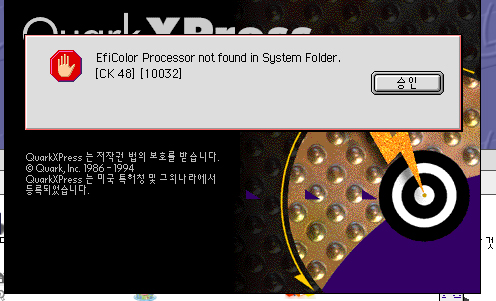 쿼크 3.3k 폴더안의 XTensions 폴더에서 Efi Color XTension을 찾아서 휴지통에 버리시면 다음부터 안나옵니다.
