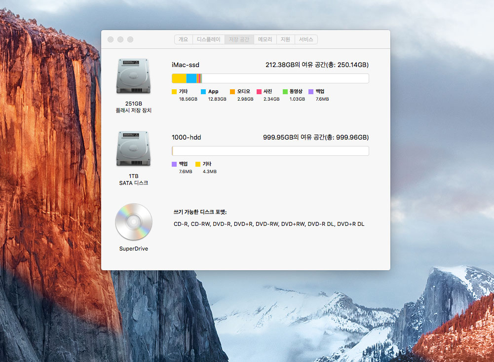 저장공간: 애플정품 SSD256 + 1TB HDD