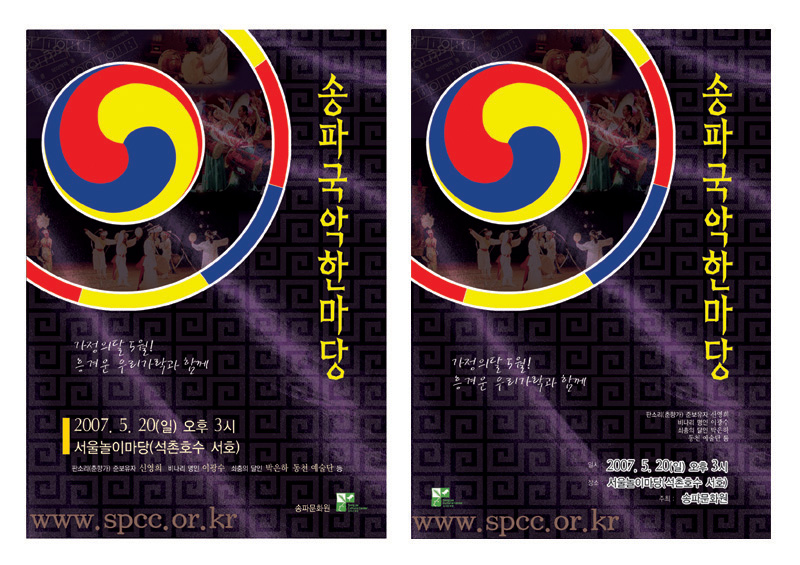 시간장소정렬은 왼쪽이 훨씬더 보기 좋습니다. 그치만 가장 중요한 날짜를 왜 굳이 명조체로하셨는지? 같은 고딕으로 가되 월일만 더 굵게 해주시는것이 더 가독성이 있지않나 싶네요.^^ 제일밑에 영문으로 들어간 홈페이지 서체는 영문서체로써주시는게 더 좋을듯하구요,(명조체인듯..?) 그리고 국악한마당의 화려한 이미지가 너무 배경에 뭍혀버려 아쉬운감이 있네요..^^;; 테클아니니 참고만하셔요; emoticon_024